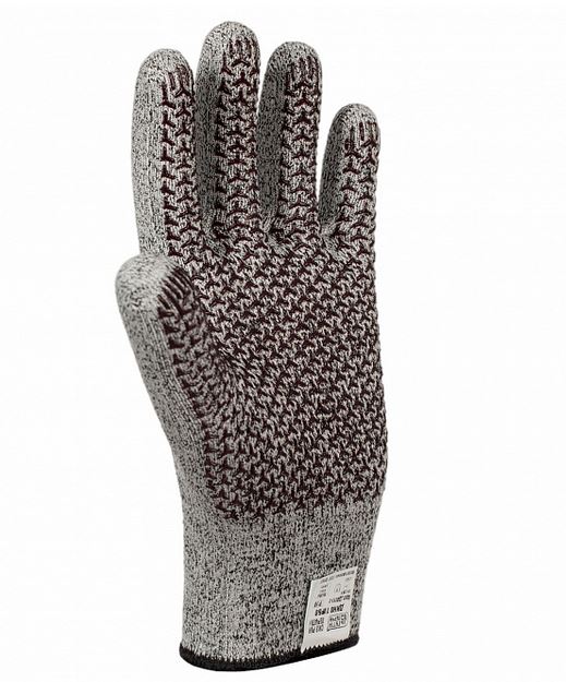 Дино Турбо- противопорезные перчатки стандартной длины с прерывистым полимерным покрытием ладонной части. Прочные и эластичные перчатки изготовлены из комплексной пряжи на основе высокомолекулярного полиэтилена- материала, используемого для изготовления брони. Данный материал получил широкое распространение в начале 21-го века и наиболее известен под товарным знаком "Дайнима". Для усиления противопорезной защиты в состав пряжи введено инновационное минеральное волокно Safix, заменяющее традиционно используемое в противопорезных перчатках стекловолокно. Стекловолокно, ломаясь в процессе носки перчаток, вызывает зуд кожи рук. Safix обладает высокой эластичностью и не ломается в процессе эксплуатации перчаток. Перчатки облегают кисти рук и обеспечивают надежную защиту от порезов, не причиняя дискомфорт. Качественная мягкая пряжа отводит излишнее тепло от рук. Прочное и цепкое покрытие из ПВХ геля без удешевляющих добавок повышают сцепные свойства перчаток с захватываемыми предметами. Высокая прочность обеспечивает высокий ресурс- перчатки служат дольше.