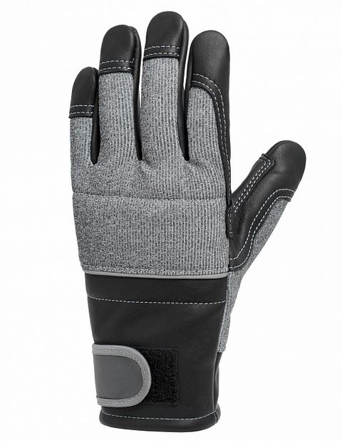 Верх: кожа КРС с ВО обработкой, полиэфир, пенополиуретан; пилостойкая вставка (в обеих перчатках): полипропилен, полиэфир;