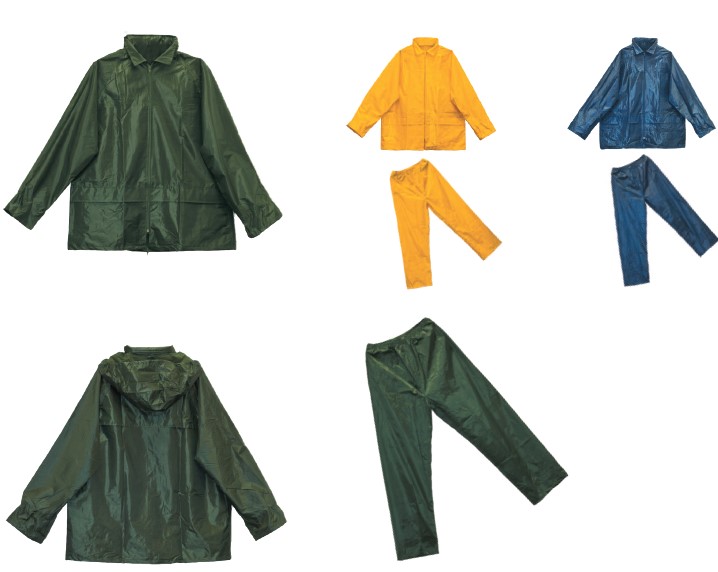 Костюм куртка+брюки, в индивидуальной упаковке. Куртка на молнии с капюшоном и двумя карманами, брюки на резинке, два кармана. Материал - нейлон с внутренним ПВХ покрытием, швы проклеены, цвета зеленый, темно-синий, желтый. р-ры M, L, XL, XXL, XXXL.