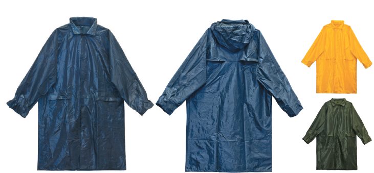 Плащ для защиты от влаги, с капюшоном, двумя карманами, в индивидуальной упаковке. Материал - нейлон с внутренним ПВХ покрытием, швы проклеены, цвета зеленый, темно-синий, желтый. р-ры L, XL, XXL, XXXL.