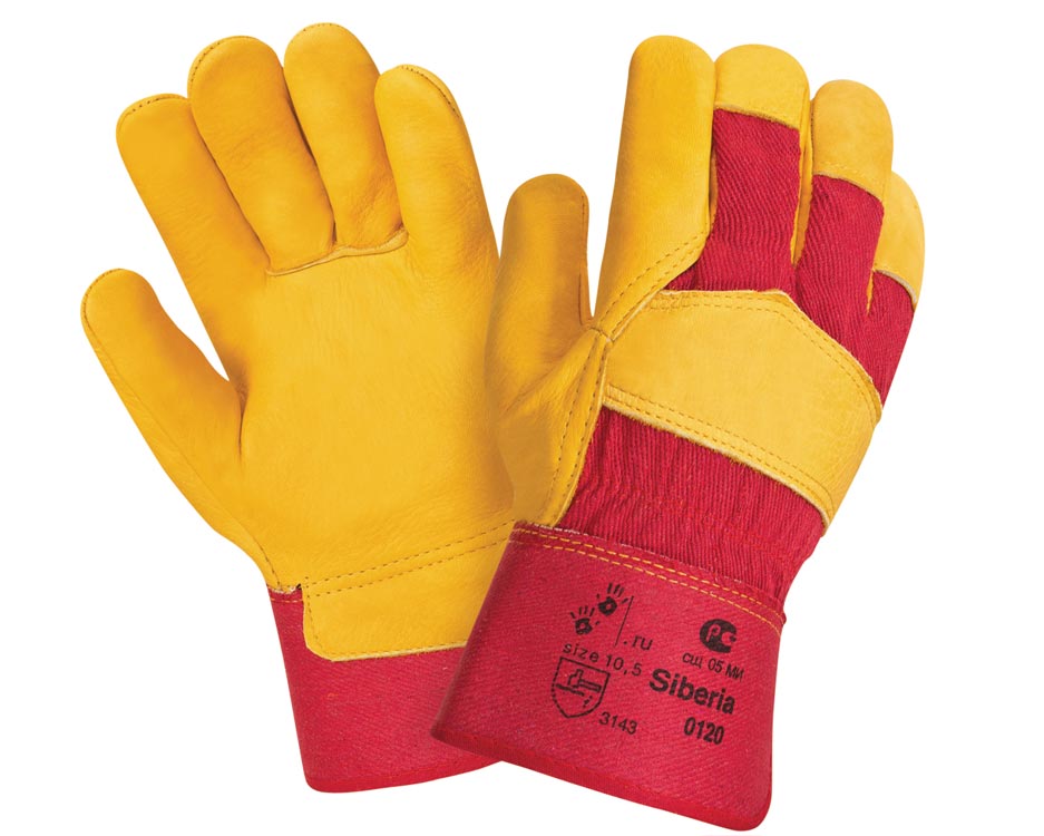 Перчатки комбинированные, плотная смесовая ткань красного цвета с кожей КРС желтого (золотого) цвета. Кожа мягкая, толщиной 1,6 мм (+/– 0,2), сорт А+, усиленная жесткая крага, флисовая подкладка на ладонной части, двойные швы. Высокая стойкость к истиранию и разрыву, ограниченная защита от пореза и прокола
