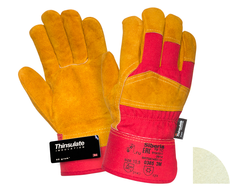 Перчатки комбинированные, плотная смесовая ткань красного цвета со спилком сорта АB желтого (золотого) цвета, усиленная жесткая крага, утеплитель- 3M Thinsulate C40 (Тинсулейт 40гр/м2). Мягкий спилок 1,5 мм (+/-0,2мм), двойные швы. Высокая стойкость к истиранию и разрыву, ограниченная защита от пореза и прокола. Размер 10,5